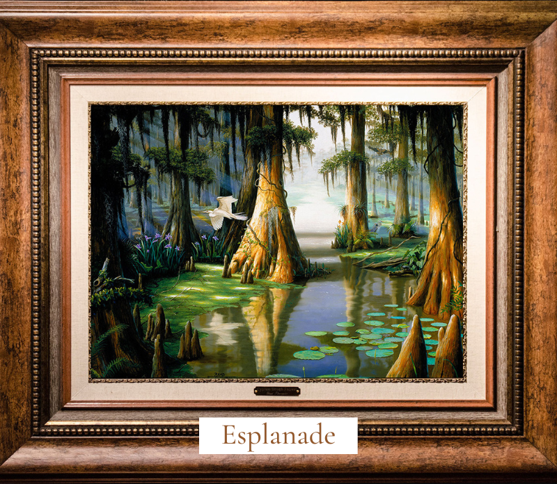 What you see in my painting is typical of what you would see in our swamps. Cypress trees and Spanish moss flowing in the brees, cypress knees, (root system coming out of the water to breathe), palmettos, lily pads, duck weed (looks like green carpet), Louisiana purple Irises, elephant ears, ferns, and resurrection ferns.